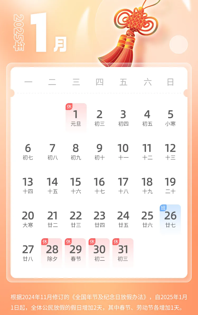 2025年1月1日(周三)放假1天